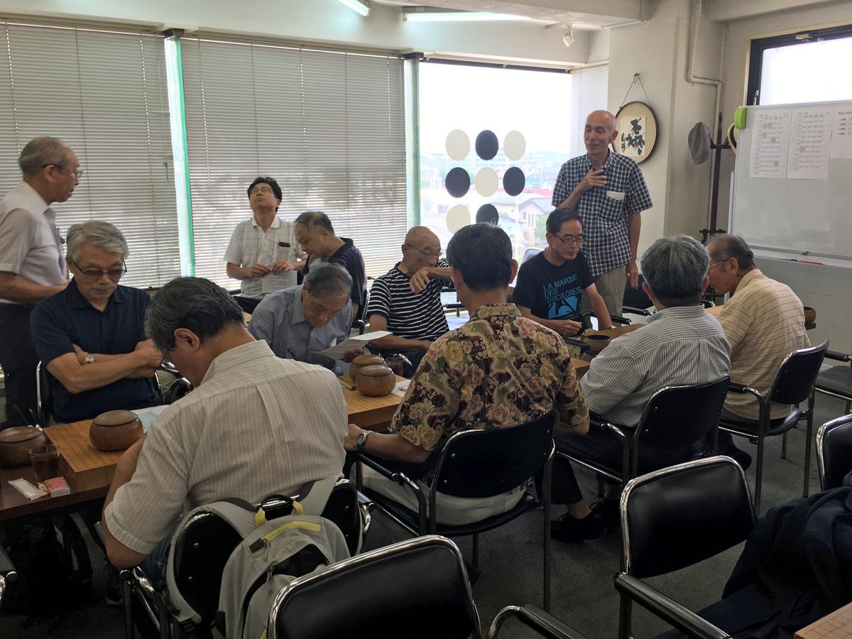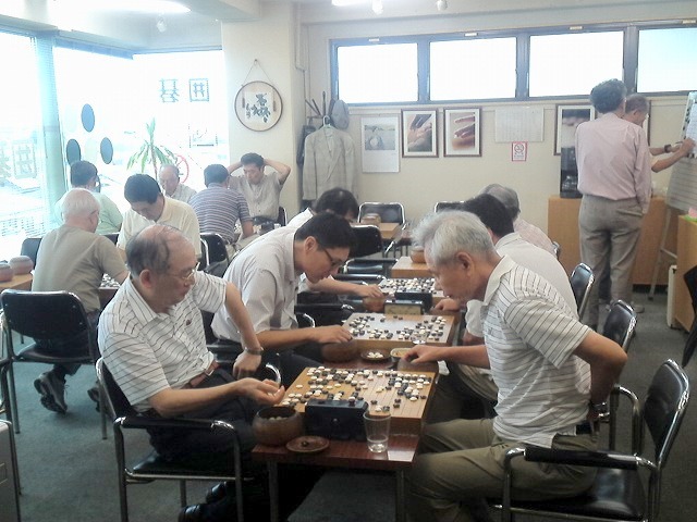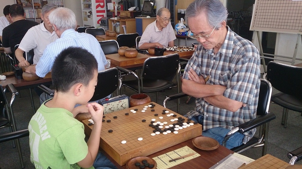 先月から始まった金曜オープン。毎週金曜日12時から4局対戦する。この日は夏休み中の川崎市の小学生も参加。こういうところに出てくる小学生はだいたい大人より強い。囲碁サロンでのポイントから私が2子置く手合い。