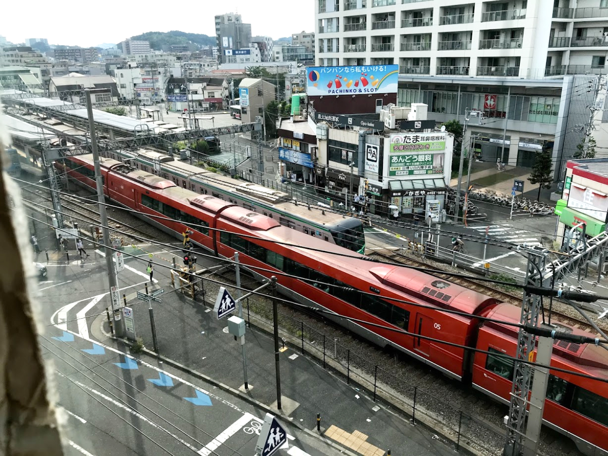 対局室のあるビルの5階から開かずの踏切と小田急線向ケ丘遊園駅(左上)