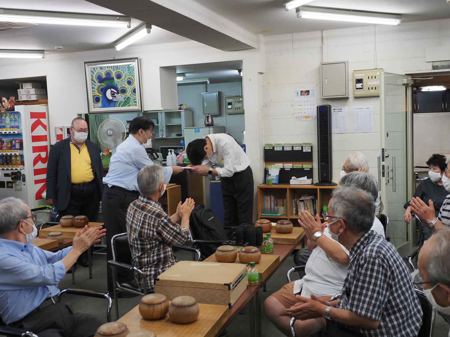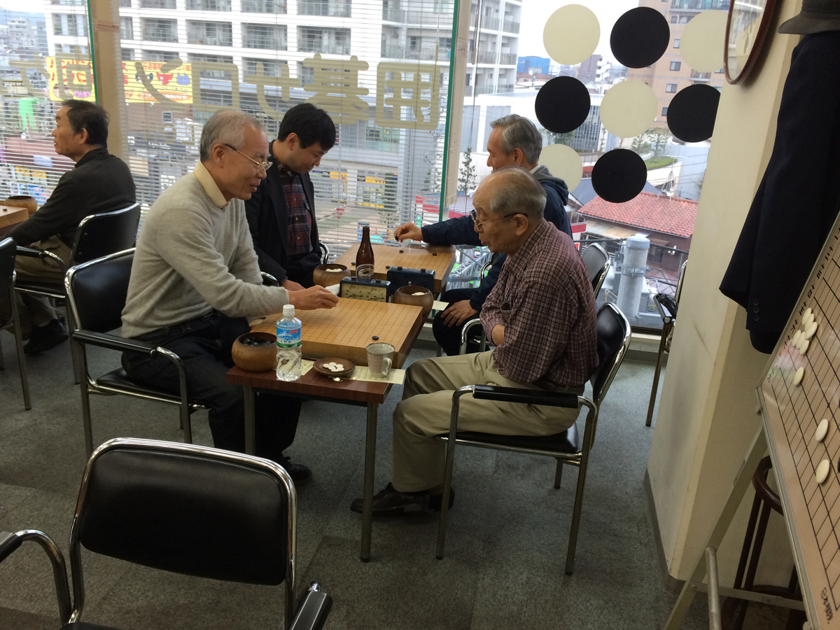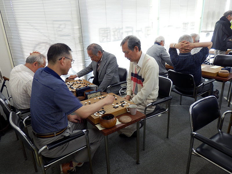 こちらに後ろ姿を見せている男性は、将棋の中原誠十六世名人。中原十六世名人は時折この碁会所を訪れており、私も何度か対局させて頂いた。病気で引退された後も将棋連盟の囲碁同好会に参加しており、日本棋院から六段の免状を送られた、とNHKの囲碁フォーカスで放送された。