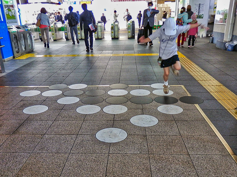 日本棋院での例会には多くの囲碁部員が参加しているが、意外にこのモザイクアートを知らない人が何人かいたので、この日コンパクトデジカメラを持参し 人通りが途絶えるのを待っていたら、改札口からジーパン姿のお父さんといっしょの女の子が走ってきた。咄嗟にシャッターを切った。右わきにはお父さんが微笑んでみている。