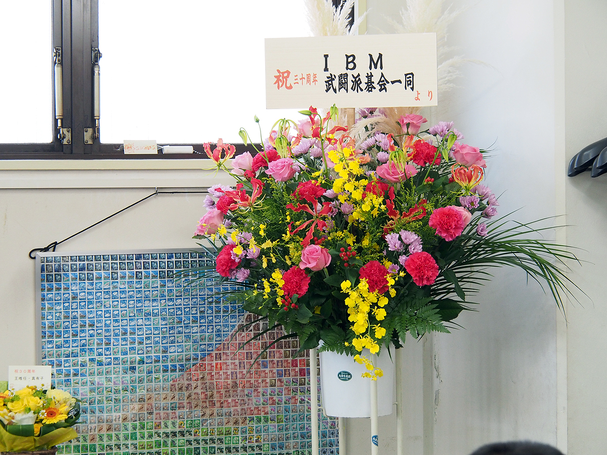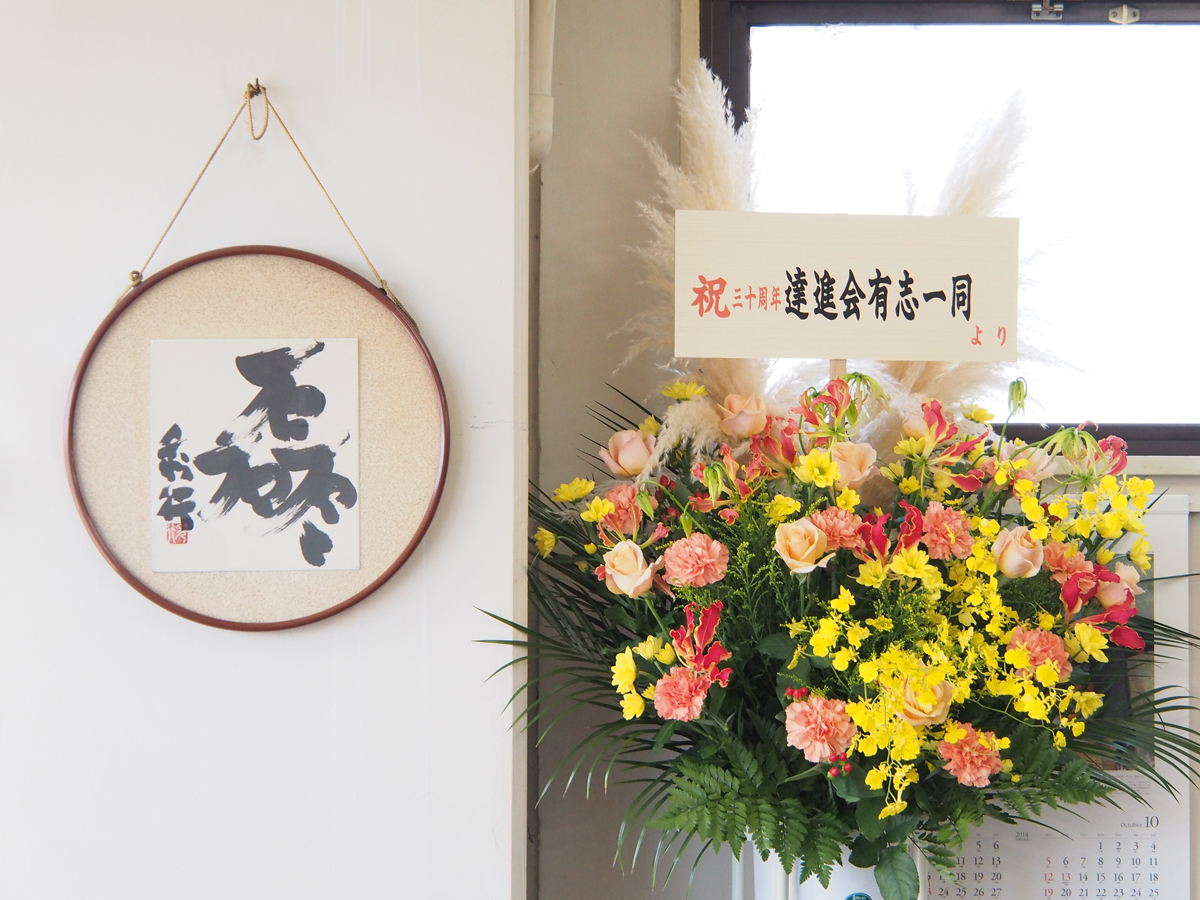 囲碁サロンは30周年を迎え、多くの花輪が送られた。壁の額は故藤沢秀行名誉棋聖直筆「磊々」。